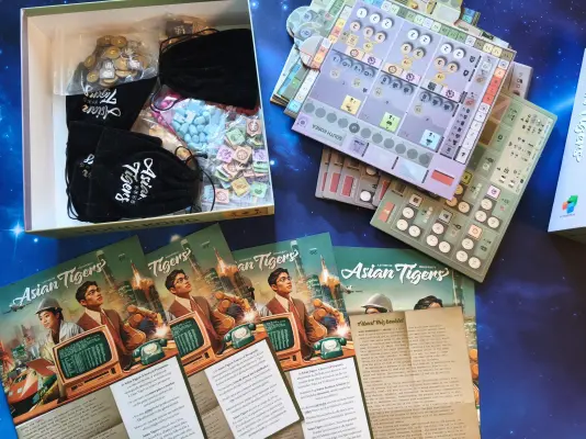 I’m selling the board game *Asian Tigers*. The game is unplayed and all components are in perfect condition. Only the bottom of the box is slightly worn (see photo).